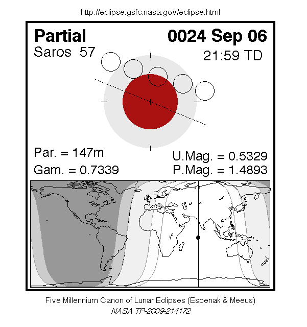 A partial eclipse of the Moon occurred on 6 September, 0024 UT Old Style, with maximum eclipse at 19:08 UT. The Earth's shadow on the moon was clearly visible in this eclipse, with 53% of the Moon in shadow; the partial eclipse lasted for 2 hours and 27 minutes.
