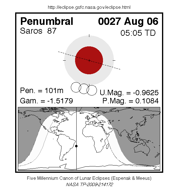 A penumbral eclipse of the Moon occurred on 6 August, 0027 UT Old Style, with maximum eclipse at 02:13 UT. In this extremely marginal eclipse, the Moon barely clipped the edge of the Earth's penumbral shadow. This caused a microscopic darkening of just 11% of the Moon's disc for 1 hour and 41 minutes, which was essentially impossible to see.