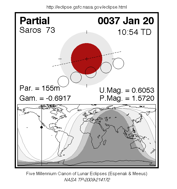 A partial eclipse of the Moon occurred on 20 January, 0037 UT Old Style, with maximum eclipse at 08:05 UT. The Moon was strikingly shadowed in this deep partial eclipse which lasted 2 hours and 35 minutes, with 61% of the Moon in darkness at maximum.
