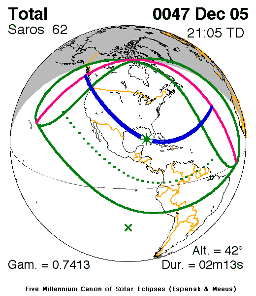 A total eclipse of the Sun occurred on 5 December, 0047 UT Old Style, with maximum eclipse at 18:16 UT. A dramatic total eclipse plunged the Sun into darkness for 2 minutes and 13 seconds at maximum, creating an amazing spectacle for observers in a path up to 119 km wide.