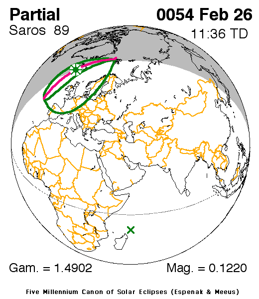 A partial eclipse of the Sun occurred on 26 February, 0054 UT Old Style, with maximum eclipse at 08:48 UT. With only 12% of the Sun covered at maximum eclipse, this was a very marginal eclipse at best, and rather uninteresting.