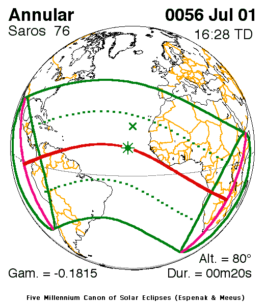 An annular eclipse of the Sun occurred on 1 July, 0056 UT Old Style, with maximum eclipse at 13:41 UT. A large annular eclipse covered over 99% of the Sun, creating a dramatic spectacle for observers in a narrow path at most 10 km wide; it lasted just 20 seconds at the point of maximum eclipse.