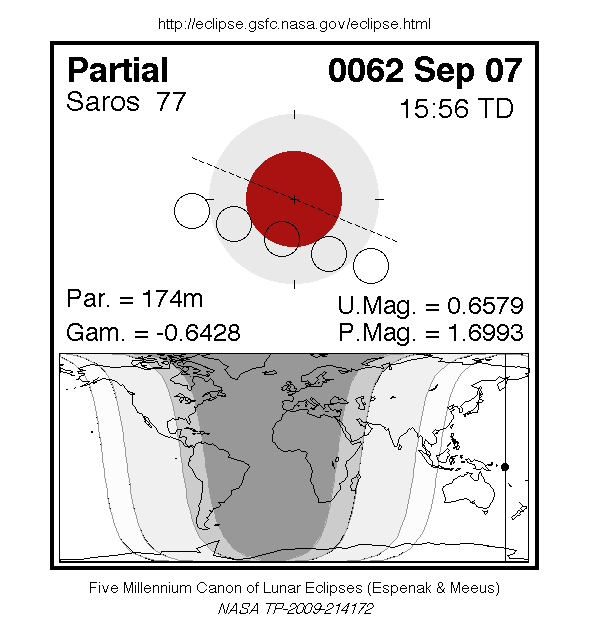 A partial eclipse of the Moon occurred on 7 September, 0062 UT Old Style, with maximum eclipse at 13:10 UT. The Moon was strikingly shadowed in this deep partial eclipse which lasted 2 hours and 54 minutes, with 66% of the Moon in darkness at maximum.