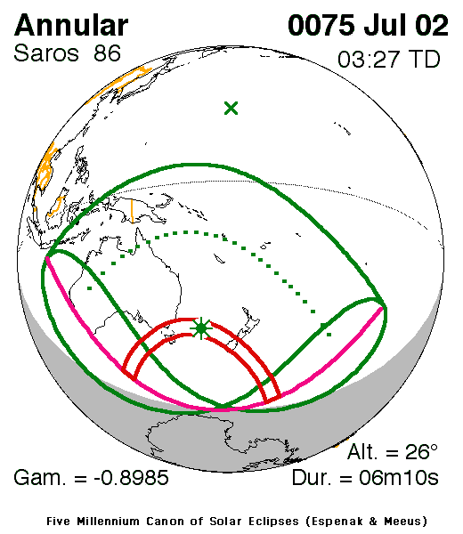 An annular eclipse of the Sun occurred on 2 July, 0075 UT Old Style, with maximum eclipse at 00:43 UT. The Sun was 94% covered in a moderate annular eclipse, lasting 6 minutes and 10 seconds and covering a very broad path, 466 km wide at maximum.