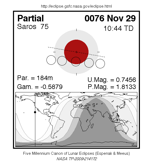 A partial eclipse of the Moon occurred on 29 November, 0076 UT Old Style, with maximum eclipse at 08:01 UT. The Moon was strikingly shadowed in this deep partial eclipse which lasted 3 hours and 4 minutes, with 75% of the Moon in darkness at maximum.
