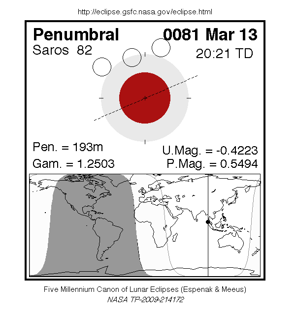 A penumbral eclipse of the Moon occurred on 13 March, 0081 UT Old Style, with maximum eclipse at 17:38 UT. This very subtle penumbral eclipse was essentially invisible to the naked eye; though it lasted 3 hours and 13 minutes, just 55% of the Moon's disc was in partial shadow (with no part of it in complete shadow).