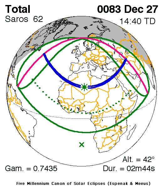 A total eclipse of the Sun occurred on 27 December, 0083 UT Old Style, with maximum eclipse at 11:58 UT. A dramatic total eclipse plunged the Sun into darkness for 2 minutes and 44 seconds at maximum, creating an amazing spectacle for observers in a path up to 147 km wide.