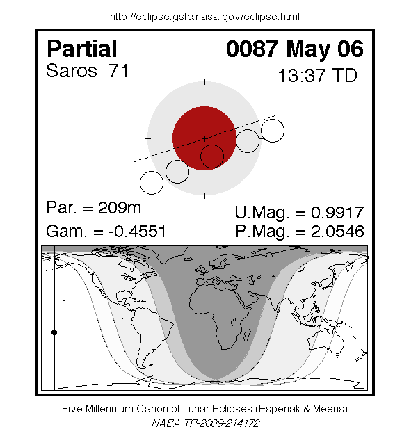 A partial eclipse of the Moon occurred on 6 May, 0087 UT Old Style, with maximum eclipse at 10:55 UT. The Moon was almost covered by the Earth's shadow in a very deep partial eclipse, which lasted 3 hours and 29 minutes. With 99% of the Moon in shadow at maximum eclipse, this was quite a memorable event.