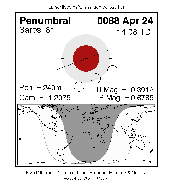 A penumbral eclipse of the Moon occurred on 24 April, 0088 UT Old Style, with maximum eclipse at 11:26 UT. This subtle penumbral eclipse may have been visible to a skilled observer at maximum eclipse. 68% of the Moon's disc was partially shaded by the Earth (none of it was in total shadow), which caused a gentle shadow gradient across its disc at maximum; the eclipse as a whole lasted 3 hours exactly.