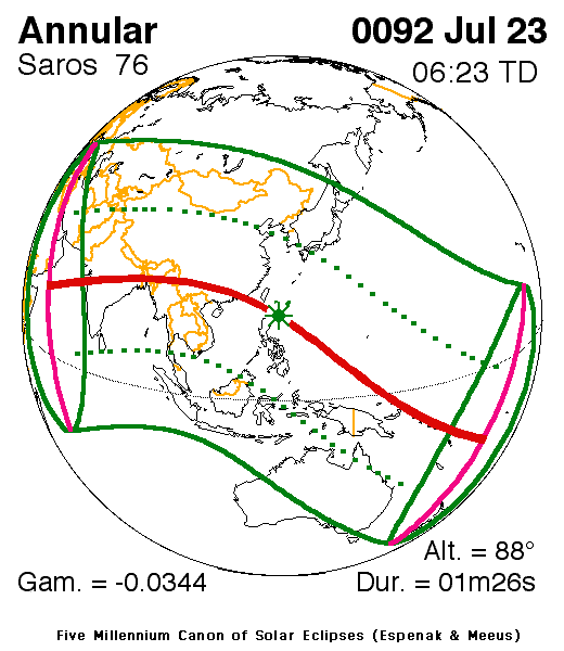 An annular eclipse of the Sun occurred on 23 July, 0092 UT Old Style, with maximum eclipse at 03:42 UT. A large annular eclipse covered 99% of the Sun, creating a dramatic spectacle for observers in a narrow path at most 46 km wide; it lasted 1 minute and 26 seconds at the point of maximum eclipse.