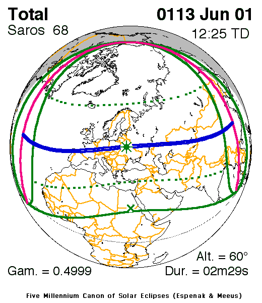 A total eclipse of the Sun occurred on 1 June, 0113 UT Old Style, with maximum eclipse at 09:47 UT. A dramatic total eclipse plunged the Sun into darkness for 2 minutes and 29 seconds at maximum, creating an amazing spectacle for observers in a path up to 121 km wide.