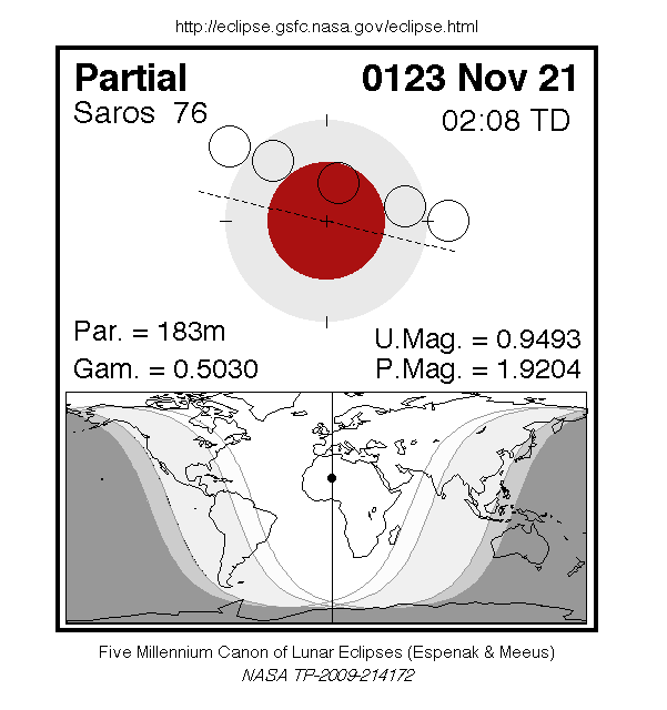 A partial eclipse of the Moon occurred on 20 November, 0123 UT Old Style, with maximum eclipse at 23:32 UT. The Moon was almost covered by the Earth's shadow in a very deep partial eclipse, which lasted 3 hours and 3 minutes. With 95% of the Moon in shadow at maximum eclipse, this was quite a memorable event.