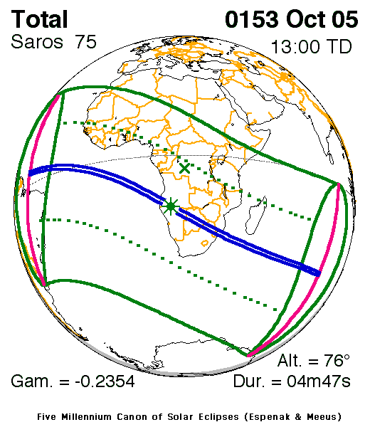 A total eclipse of the Sun occurred on 5 October, 0153 UT Old Style, with maximum eclipse at 10:29 UT. A dramatic total eclipse plunged the Sun into darkness for 4 minutes and 47 seconds at maximum, creating an amazing spectacle for observers in a broad path up to 185 km wide.