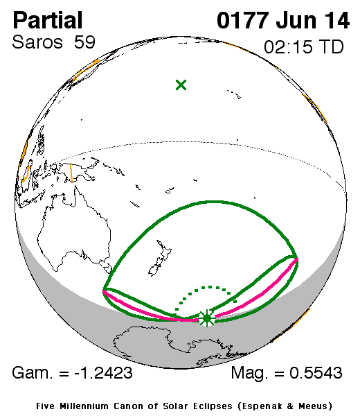 A partial eclipse of the Sun occurred on 13 June, 0177 UT Old Style, with maximum eclipse at 23:48 UT. A moderate partial eclipse, with 55% of the Sun covered for viewers closest to the center, created an interesting spectacle.