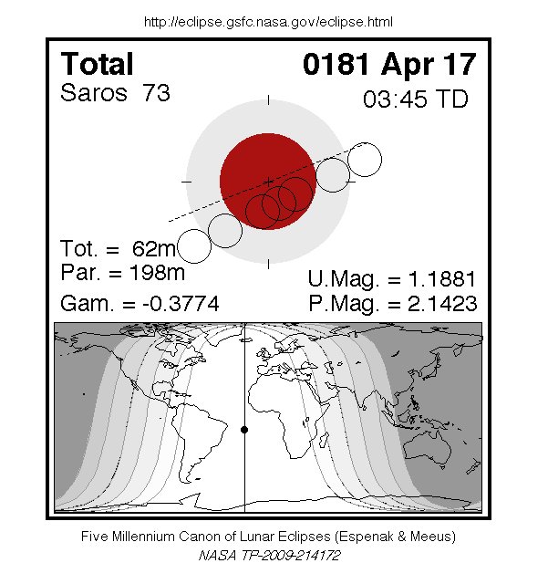 A total eclipse of the Moon occurred on 17 April, 0181 UT Old Style, with maximum eclipse at 01:18 UT. A shallow total eclipse saw the Moon in relative darkness for 1 hour and 2 minutes. The Moon was 19% of its diameter into the Earth's umbral shadow, and should have been significantly darkened. The partial eclipse lasted for 3 hours and 18 minutes in total.