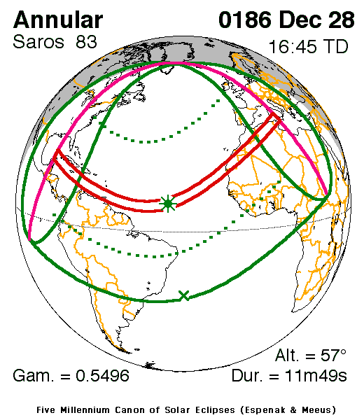 An annular eclipse of the Sun occurred on 28 December, 0186 UT Old Style, with maximum eclipse at 14:19 UT. A small annular eclipse covered only 92% of the Sun in a very broad path, 375 km wide at maximum, and lasted 11 minutes and 49 seconds.