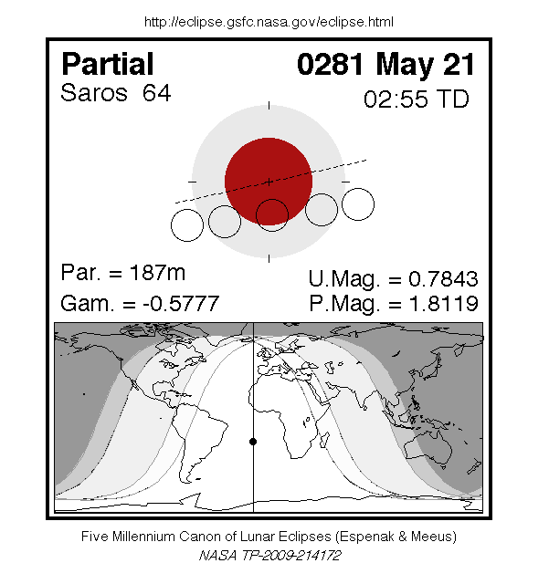 A partial eclipse of the Moon occurred on 21 May, 0281 UT Old Style, with maximum eclipse at 00:44 UT. The Moon was strikingly shadowed in this deep partial eclipse which lasted 3 hours and 7 minutes, with 78% of the Moon in darkness at maximum.