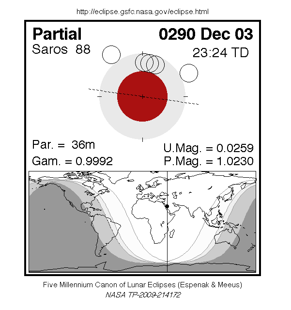 A partial eclipse of the Moon occurred on 3 December, 0290 UT Old Style, with maximum eclipse at 21:15 UT. A tiny bite out of the Moon may have been visible at maximum, though just 3% of the Moon was shadowed in a partial eclipse which lasted for 35 minutes and 48 seconds. A shading across the moon from the Earth's penumbral shadow should have been visible at maximum eclipse.