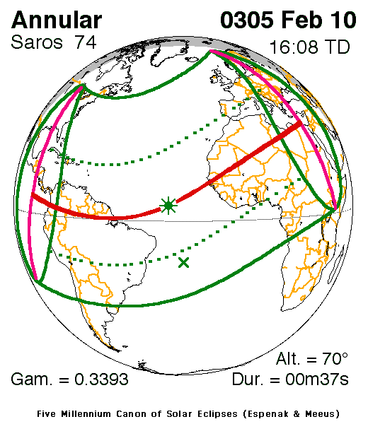 An annular eclipse of the Sun occurred on 10 February, 0305 UT Old Style, with maximum eclipse at 14:01 UT. A large annular eclipse covered over 99% of the Sun, creating a dramatic spectacle for observers in a narrow path at most 21 km wide; it lasted 37 seconds at the point of maximum eclipse.