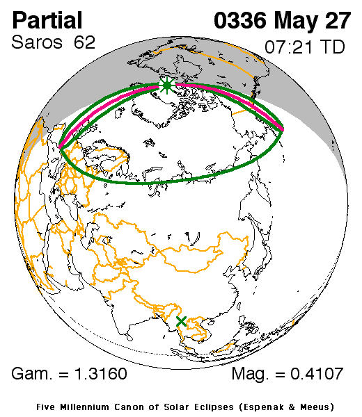 A partial eclipse of the Sun occurred on 27 May, 0336 UT Old Style, with maximum eclipse at 05:18 UT. A small partial eclipse barely darkened the Sun. With just 41% of the Sun covered for viewers closest to the center, this was of limited interest.