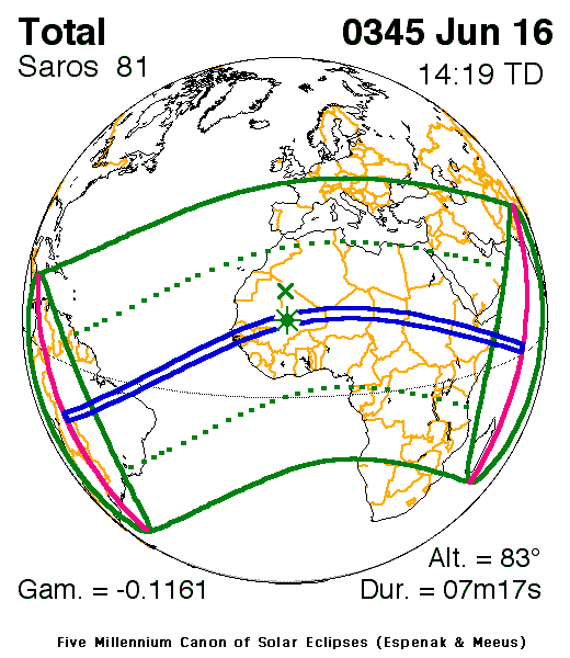 A total eclipse of the Sun occurred on 16 June, 0345 UT Old Style, with maximum eclipse at 12:18 UT. A dramatic total eclipse plunged the Sun into darkness for 7 minutes and 17 seconds at maximum, creating an amazing spectacle for observers in a very broad path, 263 km wide at maximum.