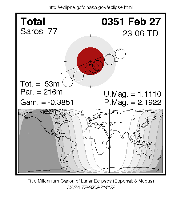 A total eclipse of the Moon occurred on 27 February, 0351 UT Old Style, with maximum eclipse at 21:06 UT. A shallow total eclipse saw the Moon in relative darkness for 53 minutes exactly. The Moon was 11% of its diameter into the Earth's umbral shadow, and should have been significantly darkened. The partial eclipse lasted for 3 hours and 36 minutes in total.