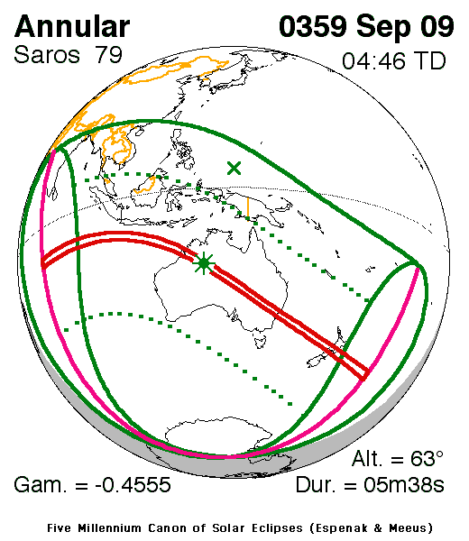An annular eclipse of the Sun occurred on 9 September, 0359 UT Old Style, with maximum eclipse at 02:47 UT. The Sun was 95% covered in a moderate annular eclipse, lasting 5 minutes and 38 seconds and covering a broad path up to 196 km wide.