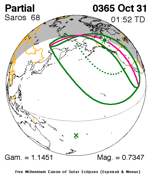 A partial eclipse of the Sun occurred on 30 October, 0365 UT Old Style, with maximum eclipse at 23:55 UT. A moderate partial eclipse, with 73% of the Sun covered for viewers closest to the center, created an interesting spectacle.