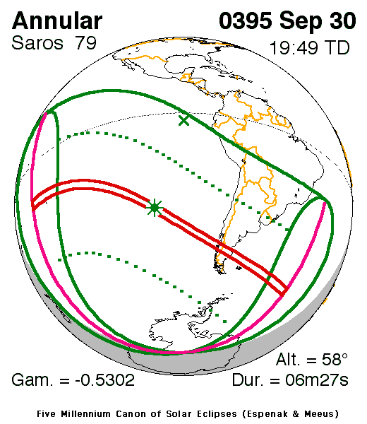 An annular eclipse of the Sun occurred on 30 September, 0395 UT Old Style, with maximum eclipse at 17:56 UT. The Sun was 94% covered in a moderate annular eclipse, lasting 6 minutes and 27 seconds and covering a very broad path, 255 km wide at maximum.