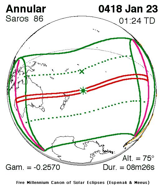 An annular eclipse of the Sun occurred on 22 January, 0418 UT Old Style, with maximum eclipse at 23:36 UT. A small annular eclipse covered only 93% of the Sun in a very broad path, 275 km wide at maximum, and lasted 8 minutes and 26 seconds.
