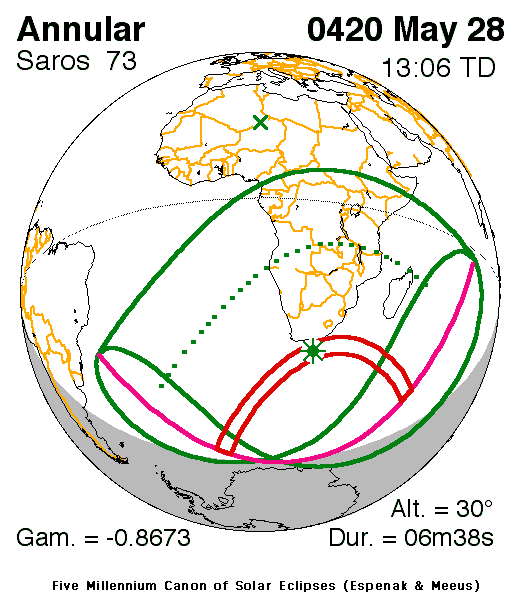 An annular eclipse of the Sun occurred on 28 May, 0420 UT Old Style, with maximum eclipse at 11:17 UT. The Sun was 94% covered in a moderate annular eclipse, lasting 6 minutes and 38 seconds and covering a very broad path, 430 km wide at maximum.