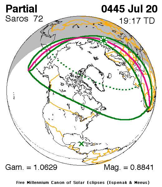 A partial eclipse of the Sun occurred on 20 July, 0445 UT Old Style, with maximum eclipse at 17:33 UT. This was a deep partial eclipse, with 88% of the Sun covered for viewers closest to the center. This provided a significant spectacle for those who saw it.