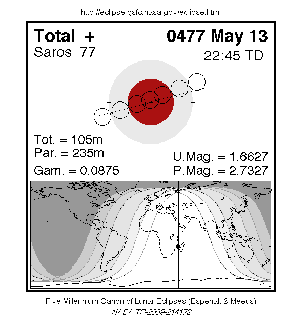 A total eclipse of the Moon occurred on 13 May, 0477 UT Old Style, with maximum eclipse at 21:06 UT. A dramatic total eclipse lasting 1 hour and 45 minutes plunged the full Moon into deep darkness, as it passed right through the centre of the Earth's umbral shadow. While the visual effect of a total eclipse is variable, the Moon may have been stained a deep orange or red colour at maximum eclipse. This was a great spectacle for everyone who saw it. The partial eclipse lasted for 3 hours and 55 minutes in total.