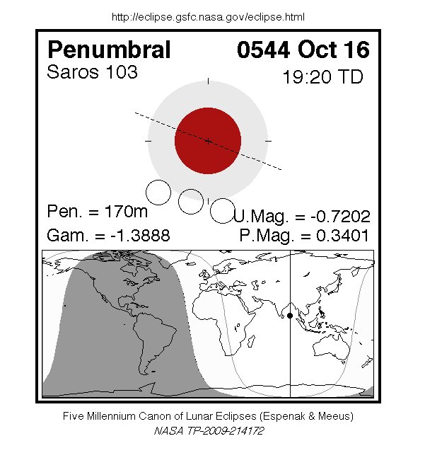 A penumbral eclipse of the Moon occurred on 16 October, 0544 UT Old Style, with maximum eclipse at 17:52 UT. This very subtle penumbral eclipse was essentially invisible to the naked eye; though it lasted 2 hours and 50 minutes, just 34% of the Moon's disc was in partial shadow (with no part of it in complete shadow).