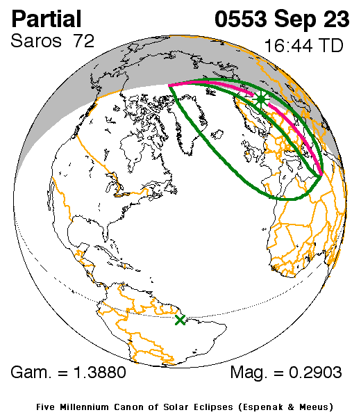 A partial eclipse of the Sun occurred on 23 September, 0553 UT Old Style, with maximum eclipse at 15:18 UT. A small partial eclipse barely darkened the Sun. With just 29% of the Sun covered for viewers closest to the center, this was of limited interest.