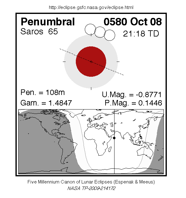 A penumbral eclipse of the Moon occurred on 8 October, 0580 UT Old Style, with maximum eclipse at 19:56 UT. In this extremely marginal eclipse, the Moon barely clipped the edge of the Earth's penumbral shadow. This caused a microscopic darkening of just 14% of the Moon's disc for 1 hour and 48 minutes, which was essentially impossible to see.
