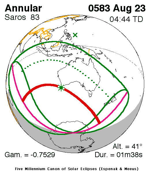 An annular eclipse of the Sun occurred on 23 August, 0583 UT Old Style, with maximum eclipse at 03:23 UT. A large annular eclipse covered 98% of the Sun, creating a dramatic spectacle for observers in a path up to 89 km wide; it lasted 1 minute and 38 seconds at the point of maximum eclipse.