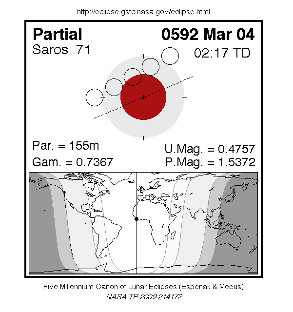 A partial eclipse of the Moon occurred on 4 March, 0592 UT Old Style, with maximum eclipse at 00:56 UT. The Earth's shadow on the moon was clearly visible in this eclipse, with 48% of the Moon in shadow; the partial eclipse lasted for 2 hours and 35 minutes.