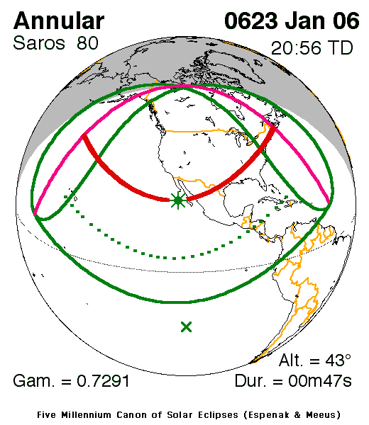 An annular eclipse of the Sun occurred on 6 January, 0623 UT Old Style, with maximum eclipse at 19:40 UT. A large annular eclipse covered over 99% of the Sun, creating a dramatic spectacle for observers in a narrow path at most 38 km wide; it lasted 47 seconds at the point of maximum eclipse.
