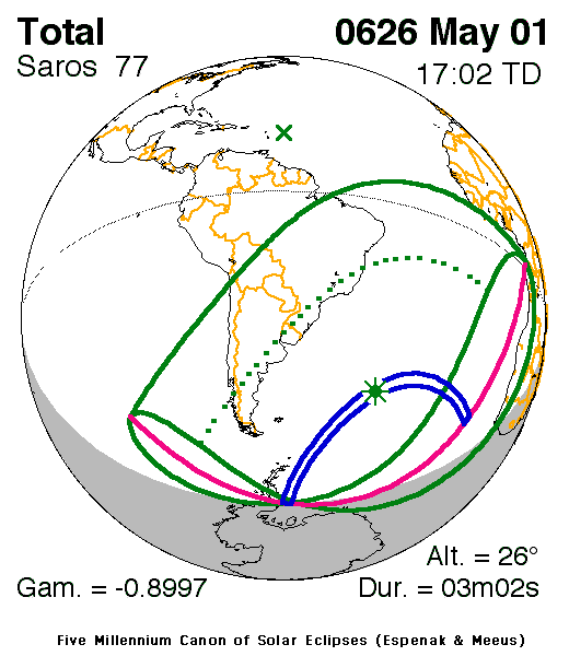A total eclipse of the Sun occurred on 1 May, 0626 UT Old Style, with maximum eclipse at 15:47 UT. A dramatic total eclipse plunged the Sun into darkness for 3 minutes and 1 second at maximum, creating an amazing spectacle for observers in a very broad path, 294 km wide at maximum.
