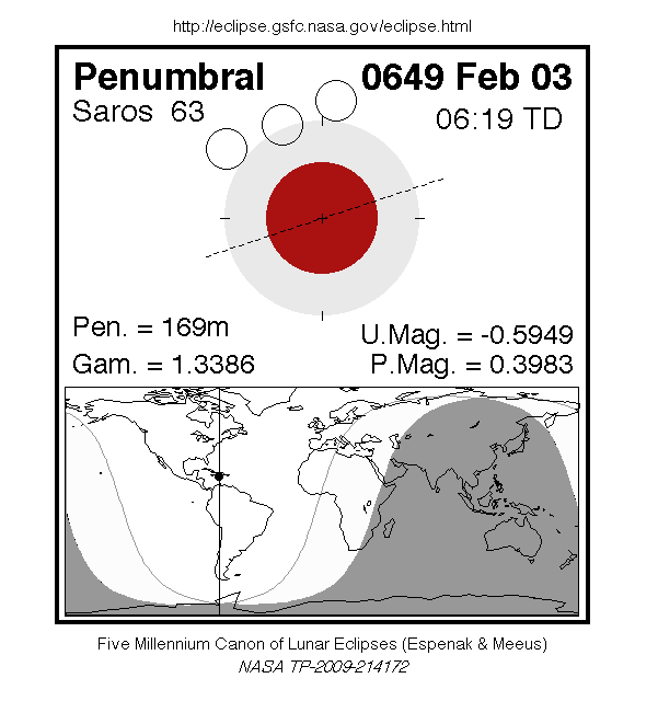 A penumbral eclipse of the Moon occurred on 3 February, 0649 UT Old Style, with maximum eclipse at 05:07 UT. This very subtle penumbral eclipse was essentially invisible to the naked eye; though it lasted 2 hours and 49 minutes, just 40% of the Moon's disc was in partial shadow (with no part of it in complete shadow).
