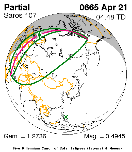A partial eclipse of the Sun occurred on 21 April, 0665 UT Old Style, with maximum eclipse at 03:39 UT. A small partial eclipse barely darkened the Sun. With just 49% of the Sun covered for viewers closest to the center, this was of limited interest.