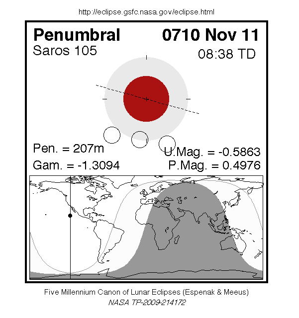 A penumbral eclipse of the Moon occurred on 11 November, 0710 UT Old Style, with maximum eclipse at 07:36 UT. This very subtle penumbral eclipse was essentially invisible to the naked eye; though it lasted 3 hours and 27 minutes, just 50% of the Moon's disc was in partial shadow (with no part of it in complete shadow).