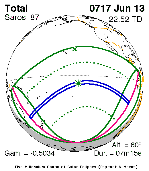 A total eclipse of the Sun occurred on 13 June, 0717 UT Old Style, with maximum eclipse at 21:51 UT. A dramatic total eclipse plunged the Sun into darkness for 7 minutes and 15 seconds at maximum, creating an amazing spectacle for observers in a very broad path, 291 km wide at maximum.