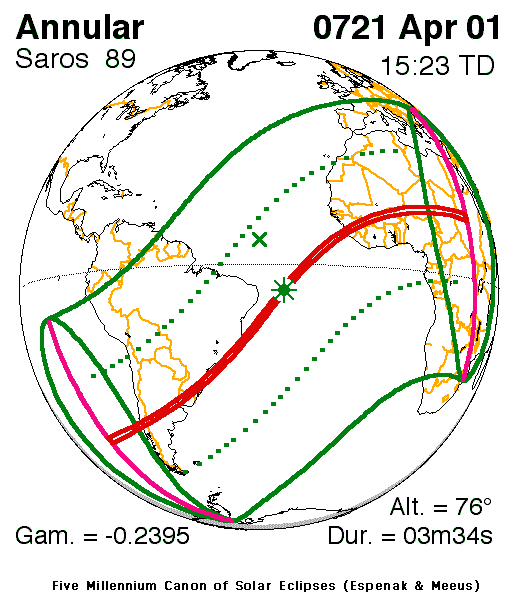The annular eclipse lasted for 3 minutes and 34 seconds. Maximum eclipse was at 14:22:58 UT.