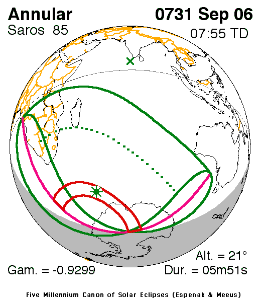 The annular eclipse lasted for 5 minutes and 51 seconds. Maximum eclipse was at 06:56:25 UT.