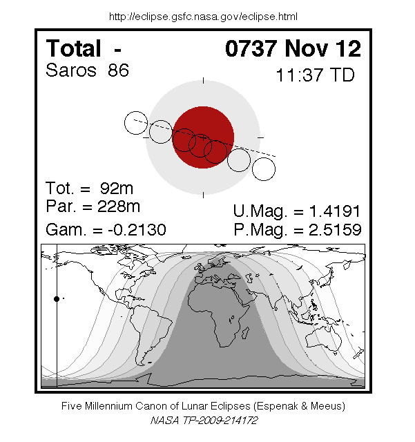 A total eclipse of the Moon occurred on 12 November, 0737 UT Old Style, with maximum eclipse at 10:39 UT. The Moon was plunged into darkness for 1 hour and 32 minutes, in a deep total eclipse which saw the Moon 42% of its diameter inside the Earth's umbral shadow. The visual effect of this depends on the state of the Earth's atmosphere, but the Moon may have been stained a deep red colour. The partial eclipse lasted for 3 hours and 48 minutes in total.