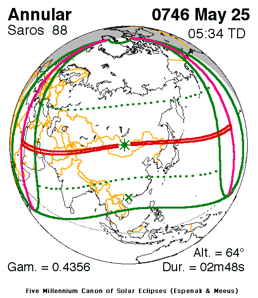 An annular eclipse of the Sun occurred on 25 May, 0746 UT Old Style, with maximum eclipse at 04:37 UT. A large annular eclipse covered 97% of the Sun, creating a dramatic spectacle for observers in a path up to 114 km wide; it lasted 2 minutes and 48 seconds at the point of maximum eclipse.
