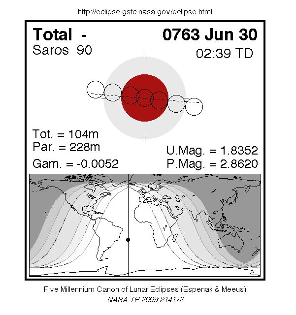A total eclipse of the Moon occurred on 30 June, 0763 UT Old Style, with maximum eclipse at 01:44 UT. A dramatic total eclipse lasting 1 hour and 44 minutes plunged the full Moon into deep darkness, as it passed right through the centre of the Earth's umbral shadow. While the visual effect of a total eclipse is variable, the Moon may have been stained a deep orange or red colour at maximum eclipse. This was a great spectacle for everyone who saw it. The partial eclipse lasted for 3 hours and 48 minutes in total.