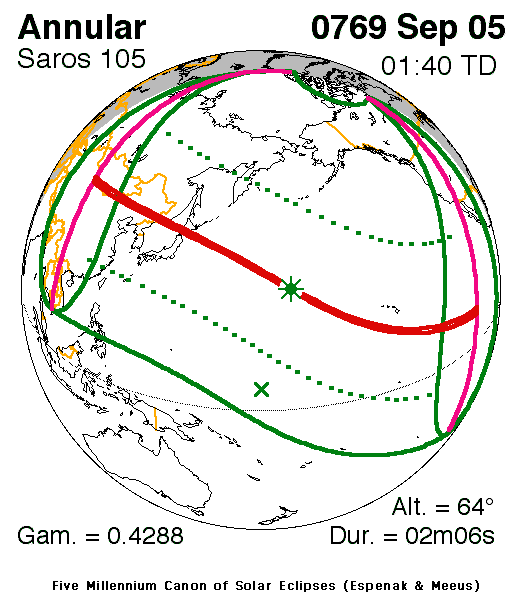 An annular eclipse of the Sun occurred on 5 September, 0769 UT Old Style, with maximum eclipse at 00:47 UT. A large annular eclipse covered 98% of the Sun, creating a dramatic spectacle for observers in a path up to 80 km wide; it lasted 2 minutes and 6 seconds at the point of maximum eclipse.